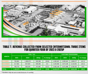 The report also tracks revenue collected from international trade, including fuel tax, customs processing fees, and motor vehicle licensing, providing another measure of economic performance during the quarter.