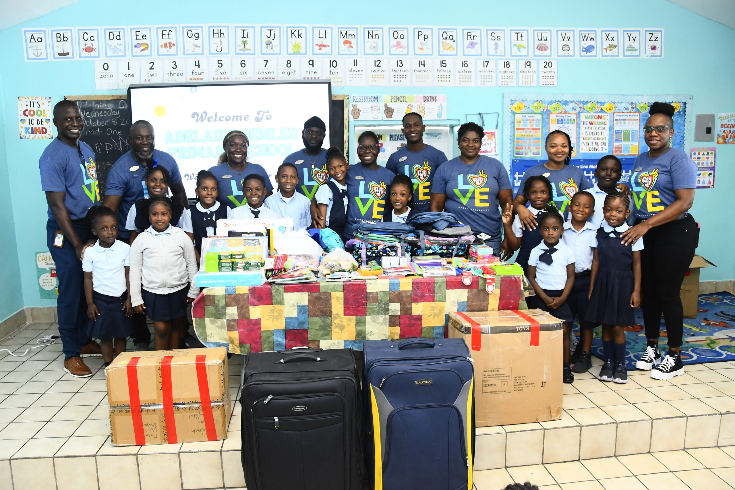 Sandals Foundation Ambassadors and students from the Adelaide Oemler Primary School share in a moment with some of the educational material for donating to the school