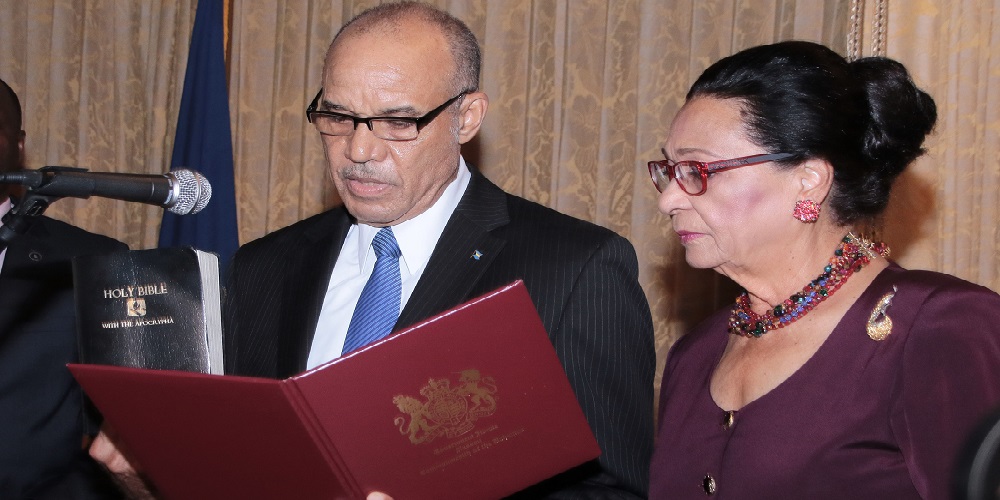 GG&PMSwearing-in of Sir Hartman Longley&Acting Chief Justic Stepheh Isaac Dec 22 2017 187207#Bahamas, December 23, 2017 – Nassau – Mr. Stephen Isaacs was sworn in as Acting Chief Justice of the Supreme Court by Governor General Her Excellency Dame Marguerite Pindling at Government House on Friday, December 22, 2017.   Prime Minister, Dr. the Hon. Hubert Minnis is also pictured as Mr. Isaacs received his Instrument of Appointment.