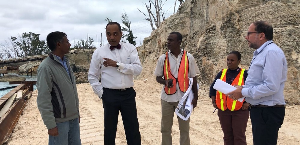 Photo caption: Pictured at the site in group consultation, from left: Sanjeev Gupta, Contractor with Bahamas Marine Construction; Romauld Ferreira, Environment & Housing Minister; Anthony Ryan, Public Analyst, Environment Ministry; Lisa Taylor, Laboratory Technician; and Robert Mouzas, Senior Structural/Civil Engineer.  Other photos are around the site.