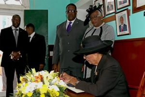 #Bahamas, April 8, 2018 – Nassau – Governor General Her Excellency Dame Marguerite Pindling paid respects to the Late Theresa Moxey-Ingraham, former Parliamentarian, in the foyer of the House of Assembly on Thursday, April 5, 2018.  She signs the Book of Condolence as Speaker of the House of Assembly the Hon. Halson Moultrie and President of the Senate the Hon. Katherine Forbes-Smith look on.