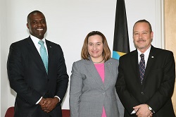 In group photo, from left: Elsworth Johnson, Minister of State for Legal Affairs; Ms. Bowers, and AG Bethel.