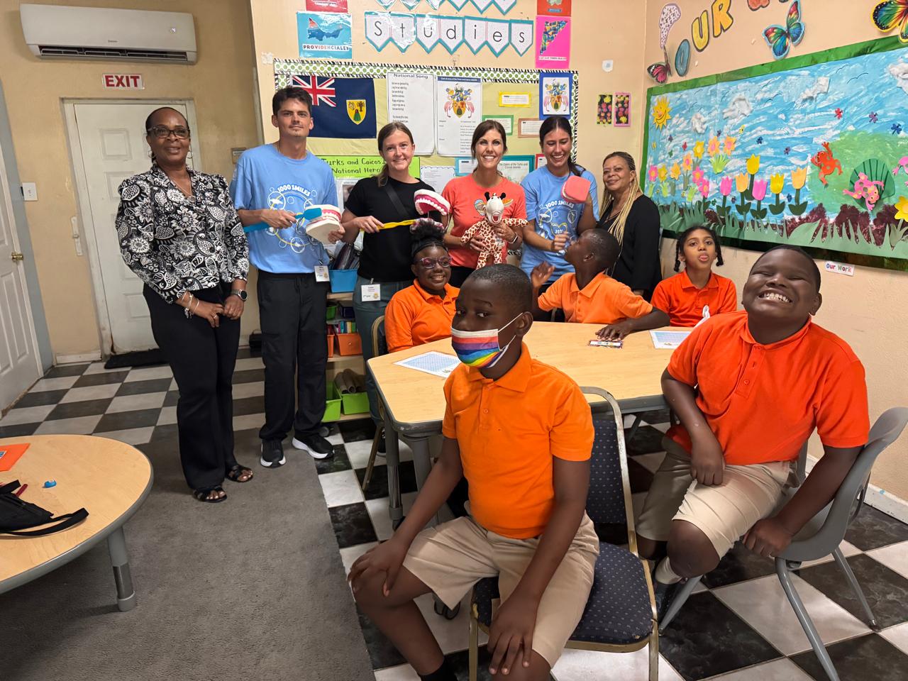 Volunteers from the Sandals Foundation and Great Shape 1000 Smiles dental programme complete an oral health presentation at the Ashley Learning Centre took time out to share in a photo opportunity with some students and teachers