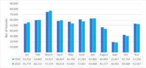 Despite the positive outlook, October and November recorded declines in stayover arrivals. Preliminary data shows 30,508 air arrivals in October, representing a seven percent decrease compared to October 2024, largely due to reduced airlift from the United States, Canada, and the United Kingdom as well as the impact of Hurricane Melissa on travel to the region. November recorded 52,547 stayover arrivals by air, a marginal one percent decrease year-on-year.