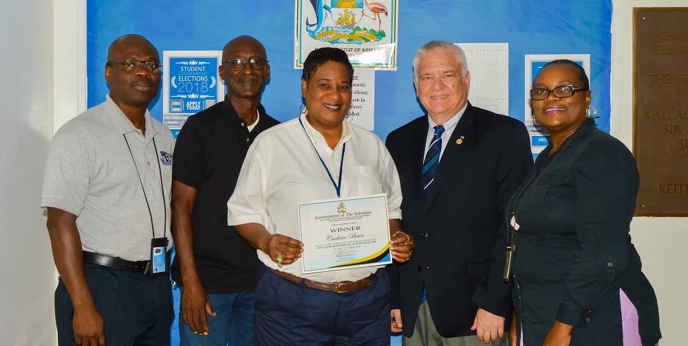 Bahamas Technical and Vocational Institute (BTVI) Grand Bahama student, Curlene Bain has landed a $5,000 grant to start a small business. She is the brainchild of FastCrafts Fast Ferry & Water Taxi Services, which she hopes to launch – thanks to the Grand Bahama Micro and Small Business Economic Empowerment and Entrepreneurial Incentive Program. From left to right are BTVI’s: Entrepreneurial Workforce Prep instructor, Sherlock Prince; Head of Auto Mechanics, Kenton Roker, Ms. Bain; President, Dr. Robert W. Robertson and Associate Vice President of the Northern Campus, Veronica Collie.