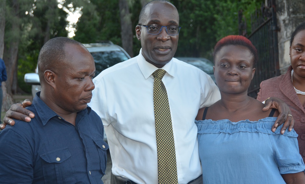 Insert: Minister of Education, Youth and Information , Senator the Hon. Ruel Reid  (centre), comforts Locksley Wilson (left); and Lavern Morgan (right) parents of 14-year-old Raven Wilson, who was recently slain. Occasion was the Minister’s visit to the family’s home in Top Road, St. Ann, on Wednesday (October 24).