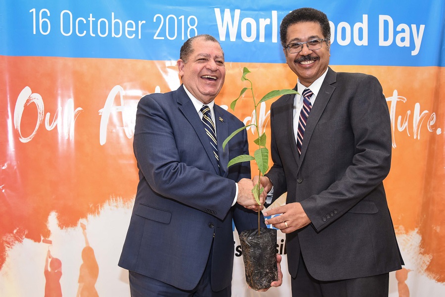 Second insert: Minister of Industry, Commerce, Agriculture and Fisheries, Hon. Audley Shaw (left), handing over a fruit seedling to President, University of Technology (UTech), Professor Stephen Vasciannie, at the opening ceremony of a two-day World Food Day conference and exhibition, on Tuesday (October 16) at the University of Technology (UTech) campus in St. Andrew.