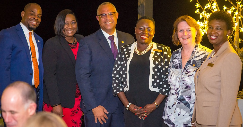 Photo Caption: For the first time in history, CIBC FirstCaribbean awarded not one but two of its branches the distinction of “Joy Callender Branch of the Year.” They are the Governor’s Harbour branch (Bahamas) and the Sheraton branch (Barbados). L to R: Quarindo Davis, CIBC FirstCaribbean Branch Manager, Governor’s Harbour, Bahamas; Gezel Farrington, Director of Banking Retail Channels, CIBC FirstCaribbean; Mark St. Hill, Managing Director of Retail and Business Banking, CIBC FirstCaribbean; Michelle Whitelaw, Director of Retail Banking Channels (Barbados), CIBC FirstCaribbean; Colette Delaney, CEO, CIBC FirstCaribbean; and Francine Arthur, CIBC FirstCaribbean Branch Manager, Sheraton, Barbados.