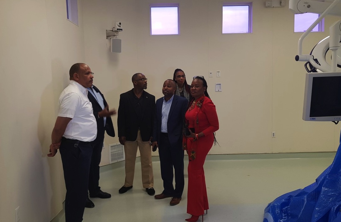 Header: Minister of Health, the Hon. Dr. Duane Sands (left), along with Minister of State for Grand Bahama Senator the Hon. Kwasi Thompson, Minister of State for Disaster Preparedness, Management and reconstruction, the Hon. Iram Lewis, and Rand Memorial Hospital Administrator, Sharon Williams view one of the operating rooms at the Rand Memorial Hospital, during a tour of the main building, December 13, 2019.