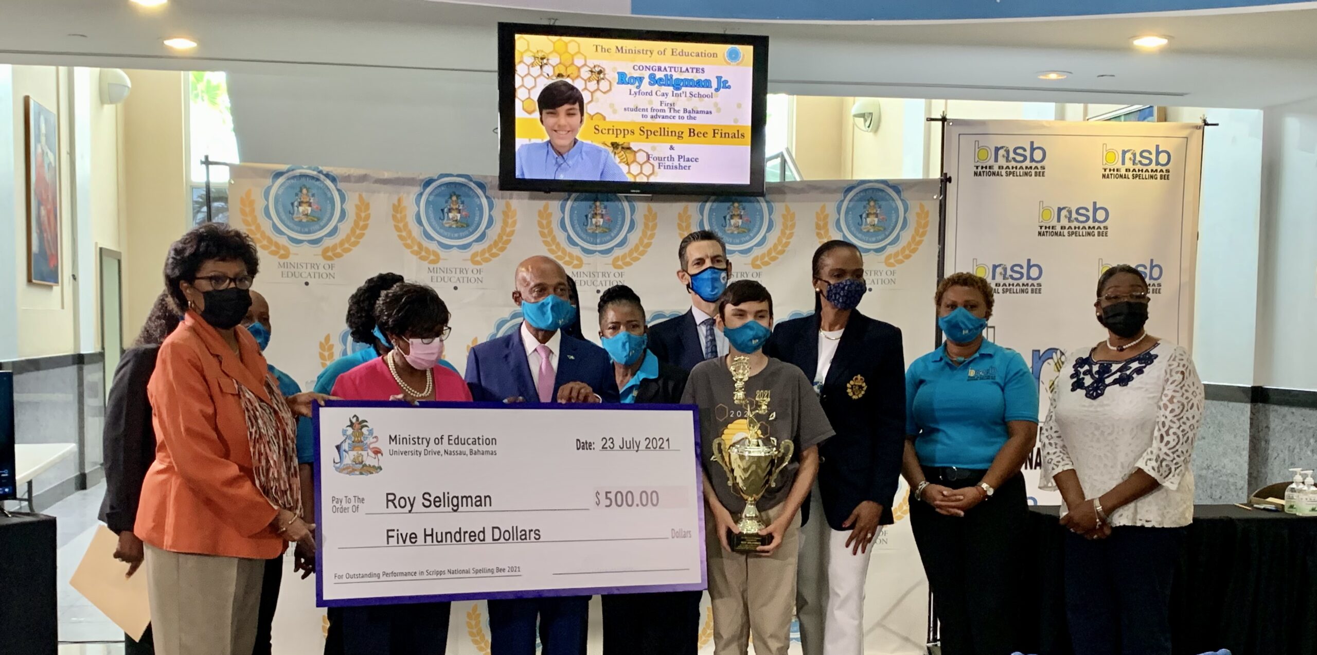 #TheBahamas, July 29, 2021 – Before cheering supporters, family, Ministry of Education (MOE) officials, and his coach, and backed by a contingent from Lyford Cay International School (LCIS), Roy Seligman, Jr., the Scripps National Spelling Bee fourth place finisher, and the first student from The Bahamas to advance to the finals — expressed thanks to the nation.