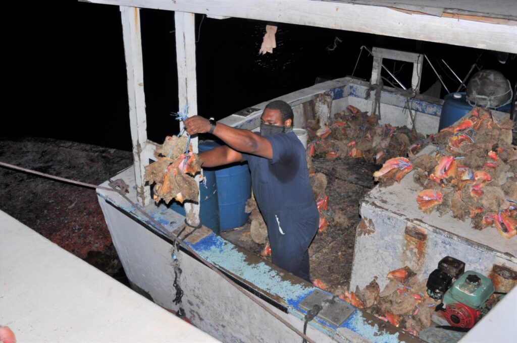 Second insert: Royal Bahamas Defence Force personnel offloading fishery products being from Bahamian fishing vessel shortly after their arrival in the capital July 31, 2021. The crew and vessel were apprehended in the Exuma chain earlier in the day for fishery violation. (RBDF Photo by Able Seaman Paul Rolle II)