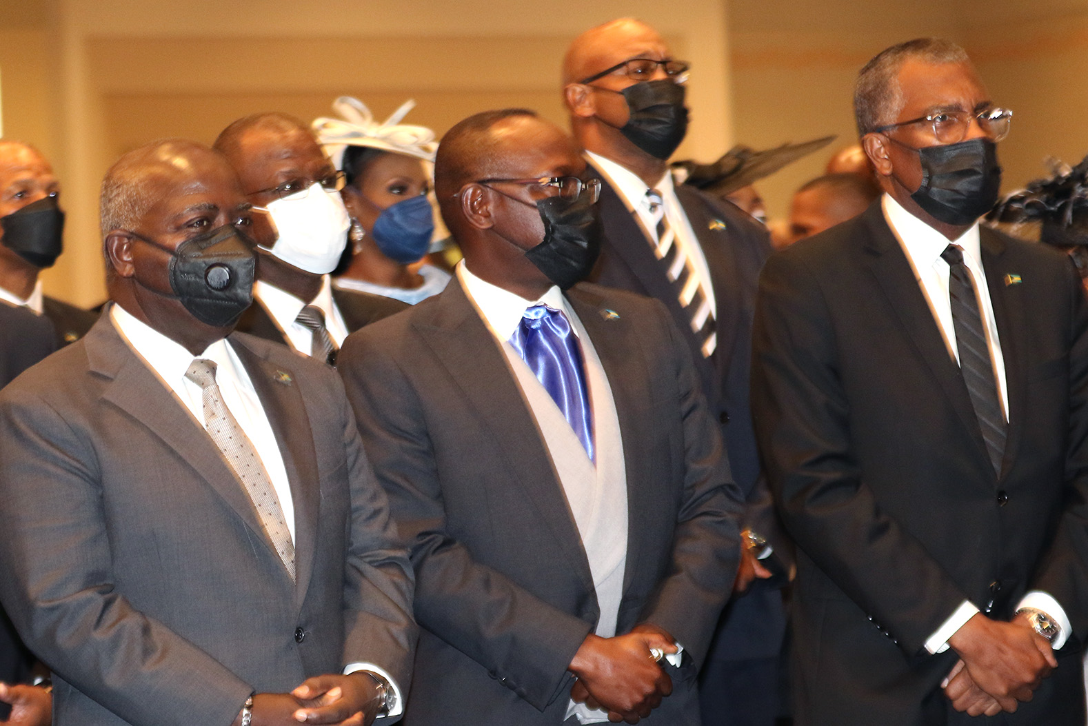 Photo Caption: The Governor General His Excellency the Most Hon. Sir Cornelius A. Smith delivers the Speech from the Throne, October 6, 2021 at Baha Mar convention centre. Also pictured are, from left Prime Minister and Minister of Finance the Hon. Philip Davis, Deputy Prime Minister and Minister of Tourism, Investment and Aviation the Hon. Chester Cooper; and Minister of Foreign Affairs the Hon. Fred Mitchell.