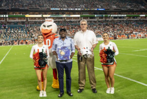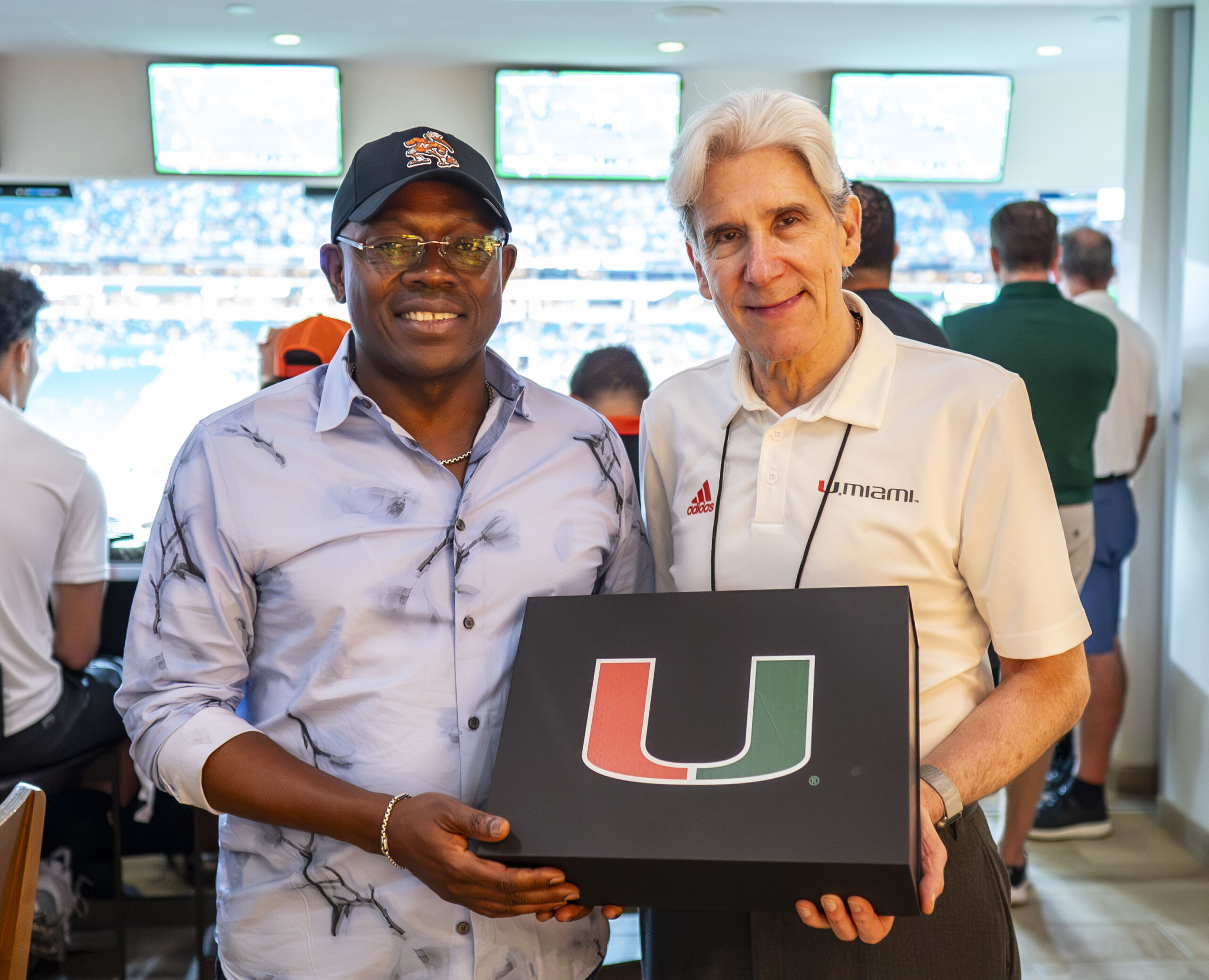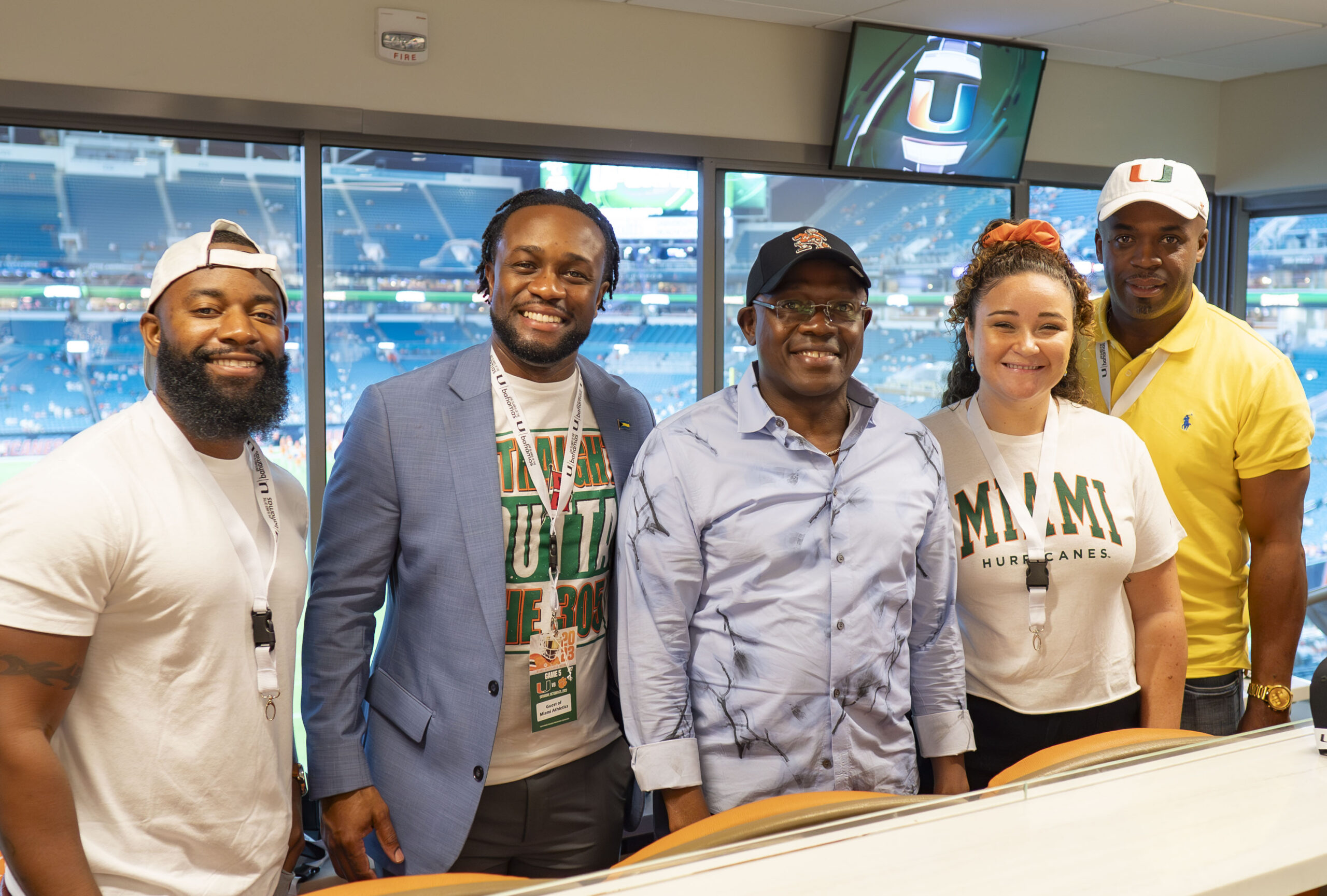 On hand to mark the launch of the multi-year partnership was the Hon. I. Chester Cooper, Deputy Prime Minister and Minister of Tourism, Investments & Aviation. The deputy prime minister led a small delegation including Senator the Hon. Randy Rolle, Global Consultant and other Ministry executives at the official sponsorship game. DPM Cooper presented a special gift on-field to Dan Radakovich, UM Director of Athletics and met with Julio Frenk UM President and Josh Friedman, President of UM’s Alumni Association.  The deputy prime minister was also proud to host industry partners, Bahamian students, athletes, and professors studying and working at the university.