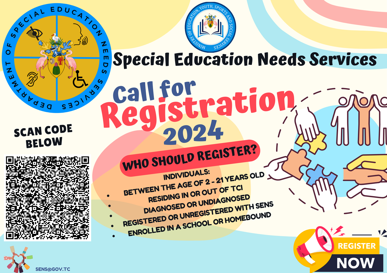 For further information or assistance with the registration process, please contact the Department of Special Education Needs Services at sens@gov.tc. Together, we can create a brighter future for our children.