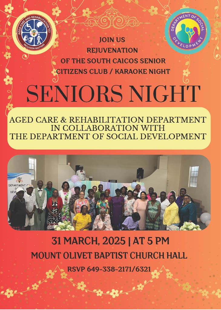 Cockburn Town, Turks and Caicos Islands, 28 March 2024 – In line with its ongoing commitment to promoting Healthy Aging as a key focus, the Aged Care and Rehabilitation Department, in partnership with the Department of Social Development, is excited to present “Seniors Night – A Karaoke Event.” This special event aims to bring joy, social connection, and holistic well-being to the senior citizens of South Caicos.