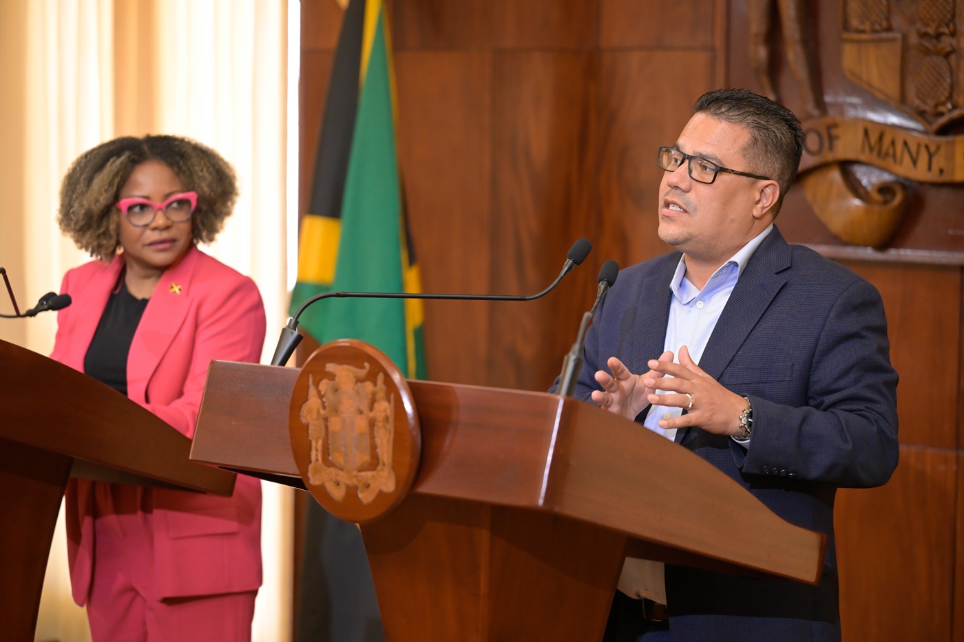 Photo Caption: Minister without Portfolio in the Ministry of Economic Growth and Job Creation, Hon. Matthew Samuda (right), addresses a Special Press Briefing on Wednesday (July 16) at Jamaica House. Looking on is Minister of Education, Skills, Youth and Information, Senator Dr. the Hon. Dana Morris Dixon.