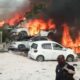 The spray of bullets also damaged property. A small black Japanese car had its window blown out, while a truck parked nearby bore visible bullet holes.