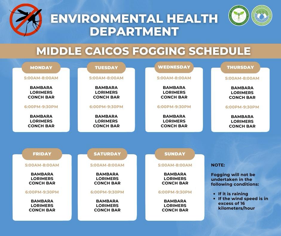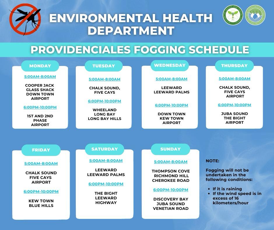 Providenciales, Turks and Caicos Islands, 29 August 2025 — The Environmental Health Department wishes to advise the public that mosquito control fogging operations will be carried out across islands over the next few days as part of ongoing efforts to reduce mosquito populations and prevent mosquito-borne diseases.