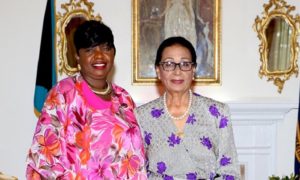 #Bahamas, April 8, 2018 – Nassau – Her Excellency Dame Marguerite Pindling, Governor General (right), welcomed Dr. Esmin Shakespeare, Assistant Professor, Department of Business Administration, Edward Waters...